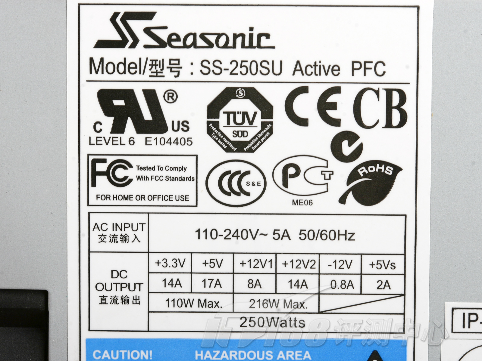 TS-639 Pro供电使用的是海韵SS-250SU电源,这是一款通过80Plus规范的产品,主动PFC设计,电能的利用率更高,250W的功率对于6-Bay NAS来说足够使用了。