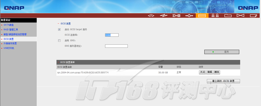 我们使用TS-639 Pro自带的iSCSI功能创建了一个容量为50GB的分区,用来测试iSCSI功能。