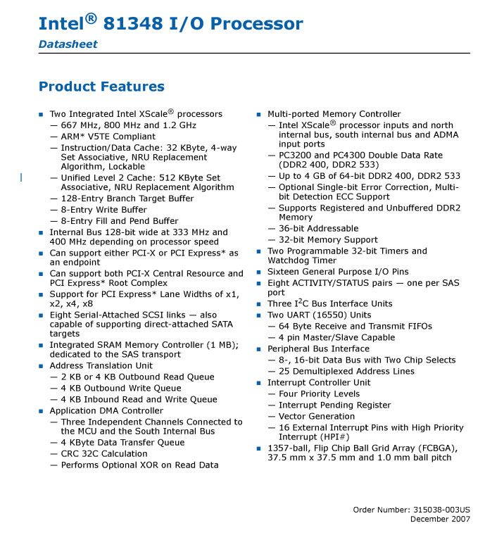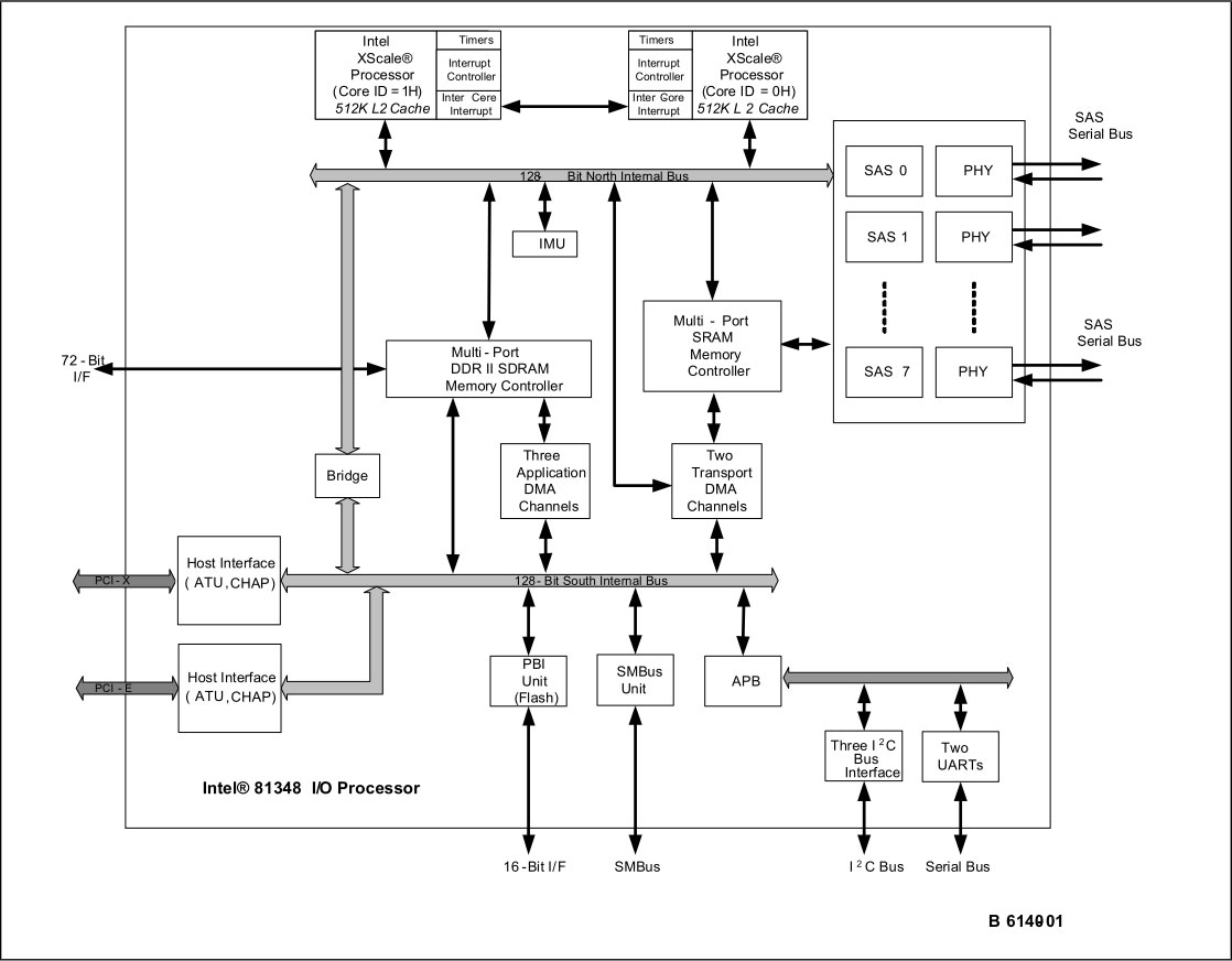 和最早期的IOP相比,IOP81348的性能受人瞩目:它集成了双核XScale处理器,最高频率达到了1.2GHz(EX8650使用的是800MHz),作为相比,早期的IOP333是单核、500MHz;IOP81348同时支持PCI-X和PCI-E界面,最高支持到PCI-E x8,同时还集成了8个SAS 3Gb/s接口,单个芯片就可以实现完整的SAS阵列卡功能,如下图所示: