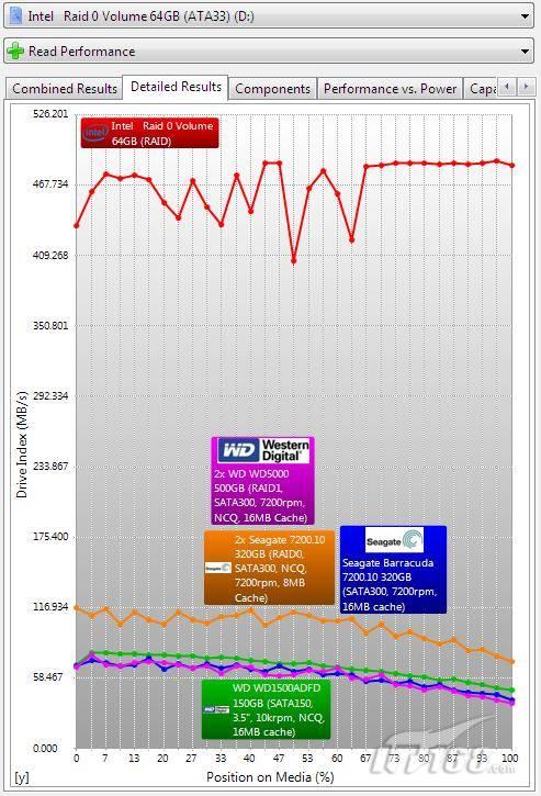 这两块硬盘都使用它们自己的SATA通道,平均读取速度攀升到了惊人的468MB/s,几乎达到了每秒0.5前兆字节的速度。