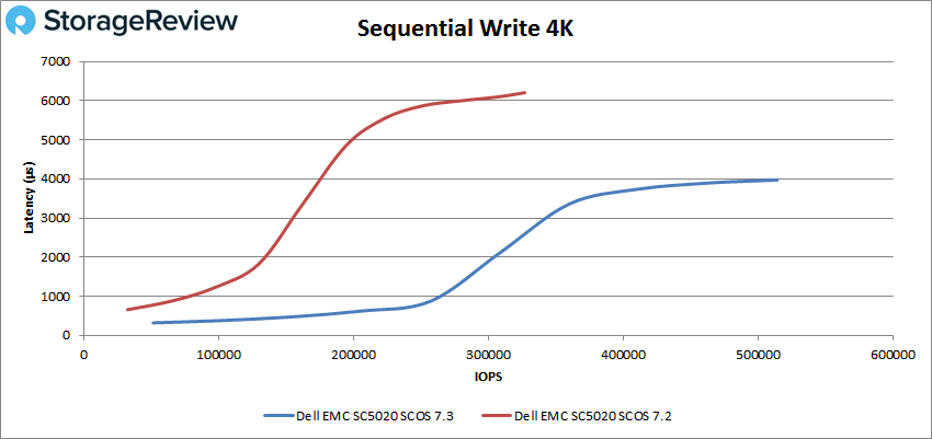 对于峰值4K随机读取,SCOS 7.2在13.1ms延迟时达到了311,436 IOPS的峰值。SCOS 7.3版本的峰值大约为450K IOPS,延迟大约为7ms。