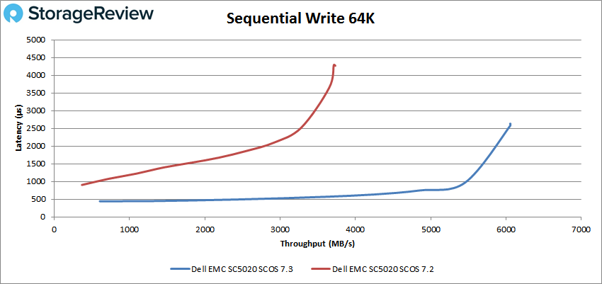 戴尔易安信SC5020 SCOS 7.2在突破1ms之前达到约210K IOPS,在峰值达到269,042 IOPS,延迟为3.8ms。7.3版本具有亚毫秒级延迟性能,直到接近350K IOPS,峰值为377,413 IOPS,延迟为2.7ms。
