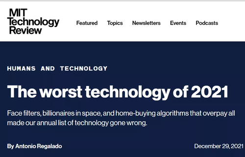 以上就是《年度创新型错误技术清单》中具有代表性的五大内容,科技始终都在进步,不管你是否承认,这些技术都在悄悄的改变我们的生活,那么对于各位小伙伴而言,2021年里对你影响最大的技术是什么呢?欢迎在下方留言。